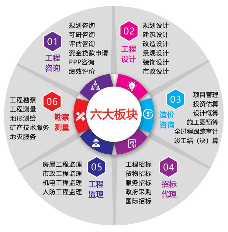 招标代理包括工程招标、货物招标、服务招标、政府采购和国际招标等; 工程监理包括房建监理、市政监理、机电监理等。